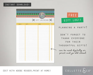 I have 3 children and have mastered the art of planning their birthday parties, including taking notes of who bought which gifts while one of my three unwraps their presents at lightning speed! I created this gift log to help me stay on top of my thank you notes! I am a sucker for stationery and love sending thank you notes! You can print this and fill it in by hand or keep it open on your laptop and fill it out in ADOBE ACROBAT READER as they unwrap!
