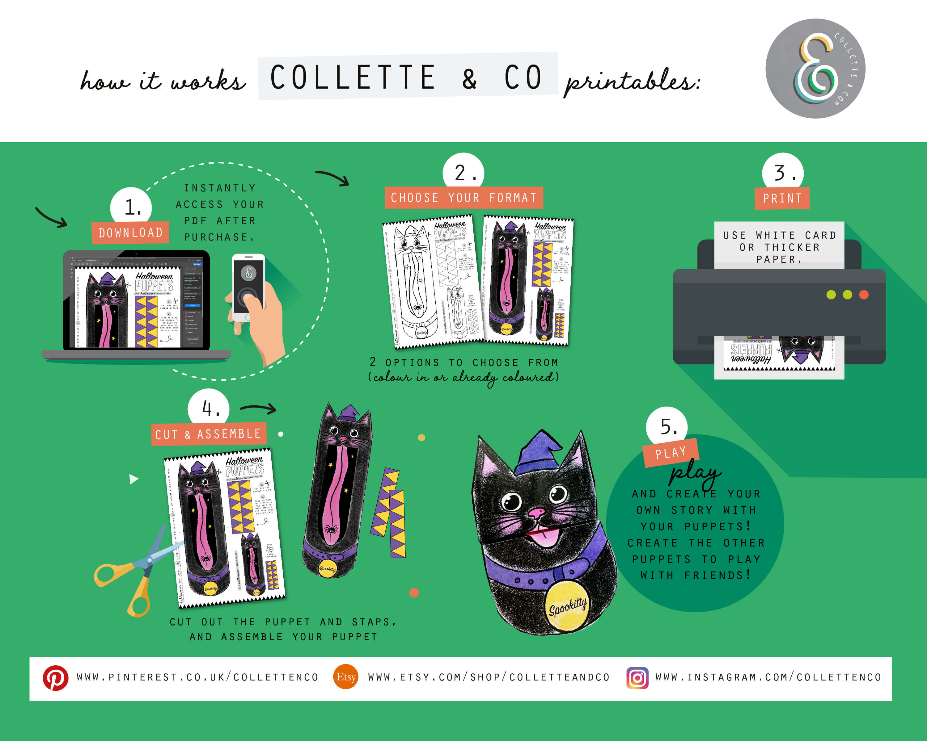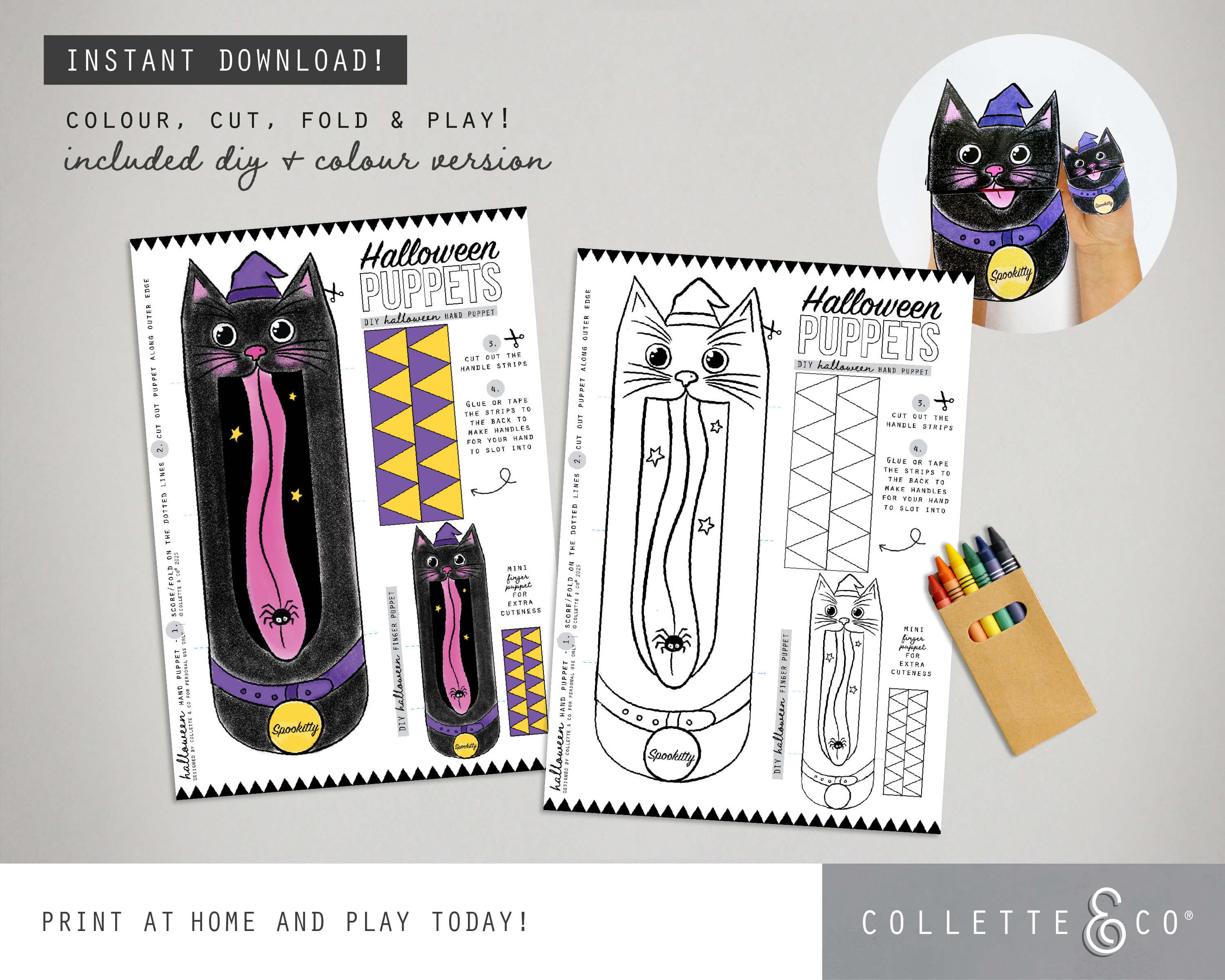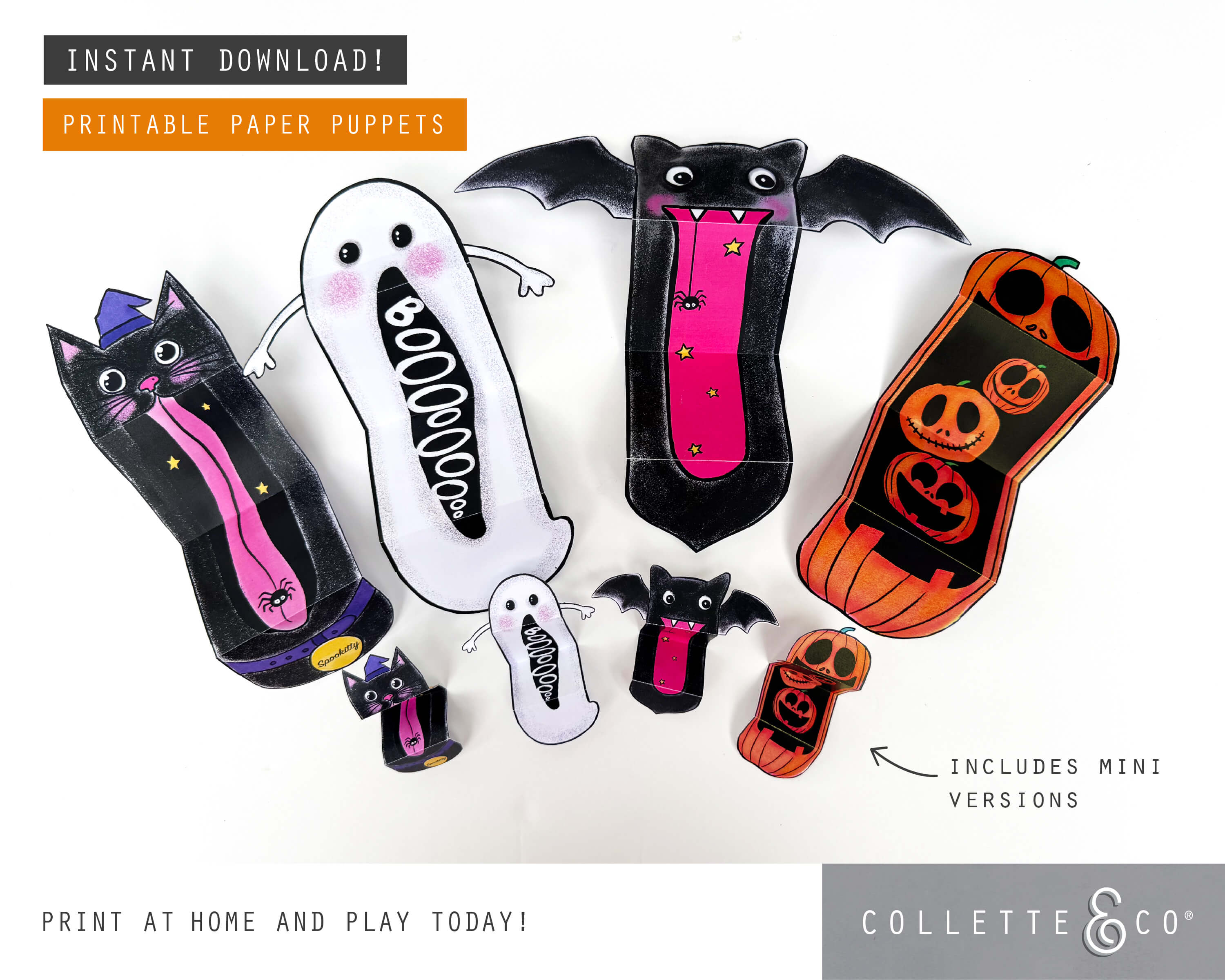 Get ready for spooky fun with these Halloween Printable Paper Puppets! This set includes 4 adorable designs — a Pumpkin, Cat, Ghost, and Bat — in small and large sizes. You’ll receive both a color-in version for kids to decorate themselves and a ready-to-create coloured version for instant Halloween fun, perfect for parties, classroom activities, or creative play at home!