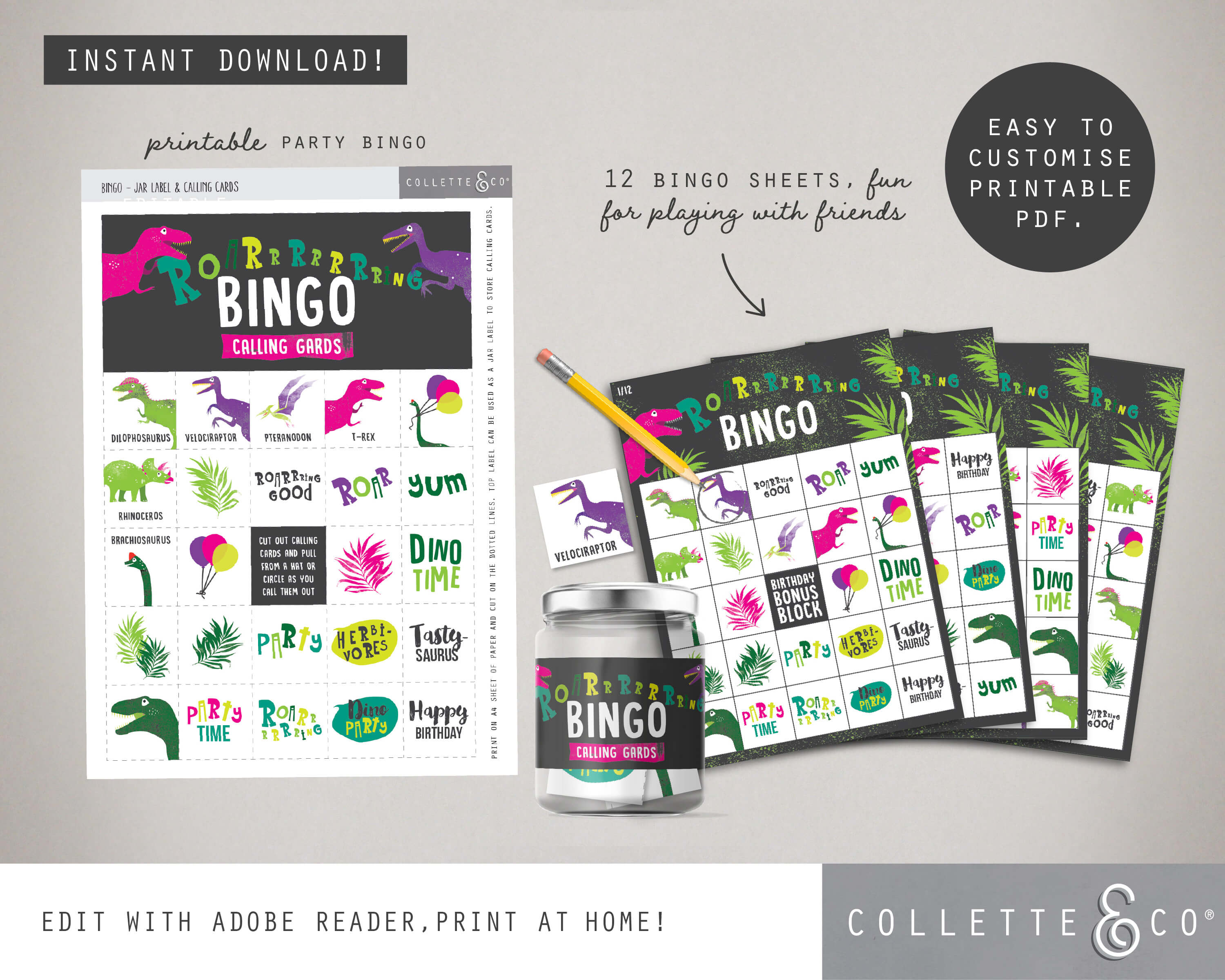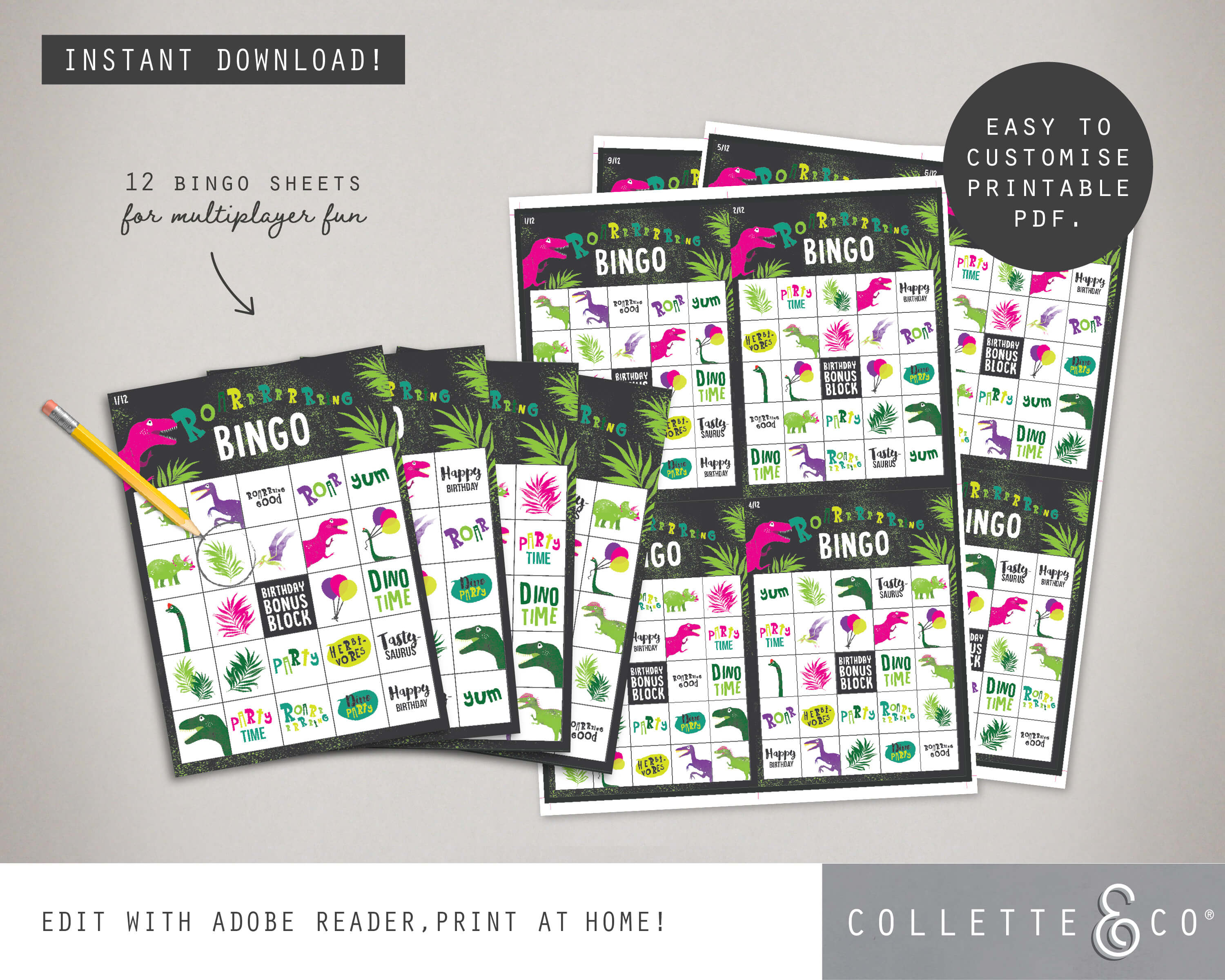 - 12 x Pink Dinosaur Party Bingo Playing Cards